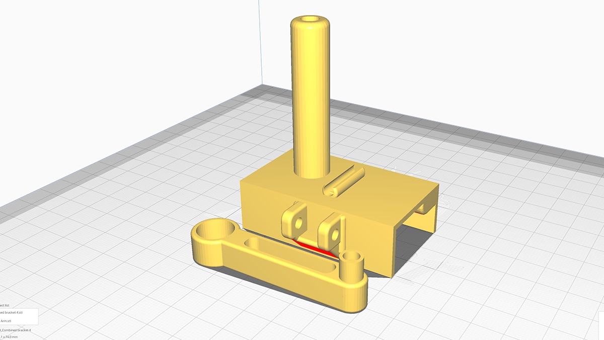 That was two cameras out the way, but what about the IR tracker? This absolutely has to be right in the centre, but that also means it’s right above the big webcam’s clamp. The obvious solution was to mount it on an arm extending out from the mast, so the clamp can fit under it. I could have integrated the arm into the design, but to avoid printing a mass of supports under the arm I opted to print it separately, with a collar at one end that’s a friction fit on the mast.
