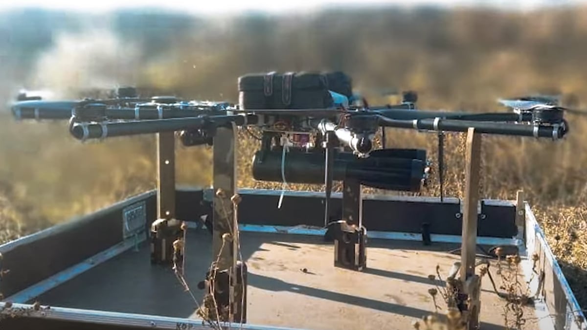 Working with Ukrainian military drone operators, PJSC Mayak designed a 3D-printable conversion kit for the RKG-3 grenade. The conversion basically involves removing the grenade’s handle and parachute, then replacing them with a 3D-printed tailcone and stabilising fins. This converts the grenade into something that looks like a tiny bomb. In fact it is a tiny bomb.