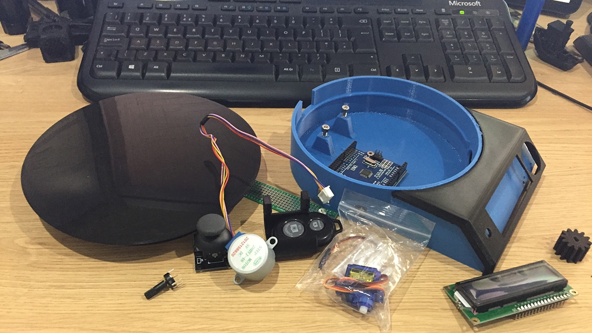 The job of the Arduino is to control the rotation speed of the platform, and let you select how many pictures to take in a full revolution. The front panel has an LED screen, which together with a small joystick and a potentiometer lets you adjust the settings. It can rotate at between one and 17rpm, and the camera can be set to take up to 200 photos per revolution – a lot more than my photogrammetry software can handle.