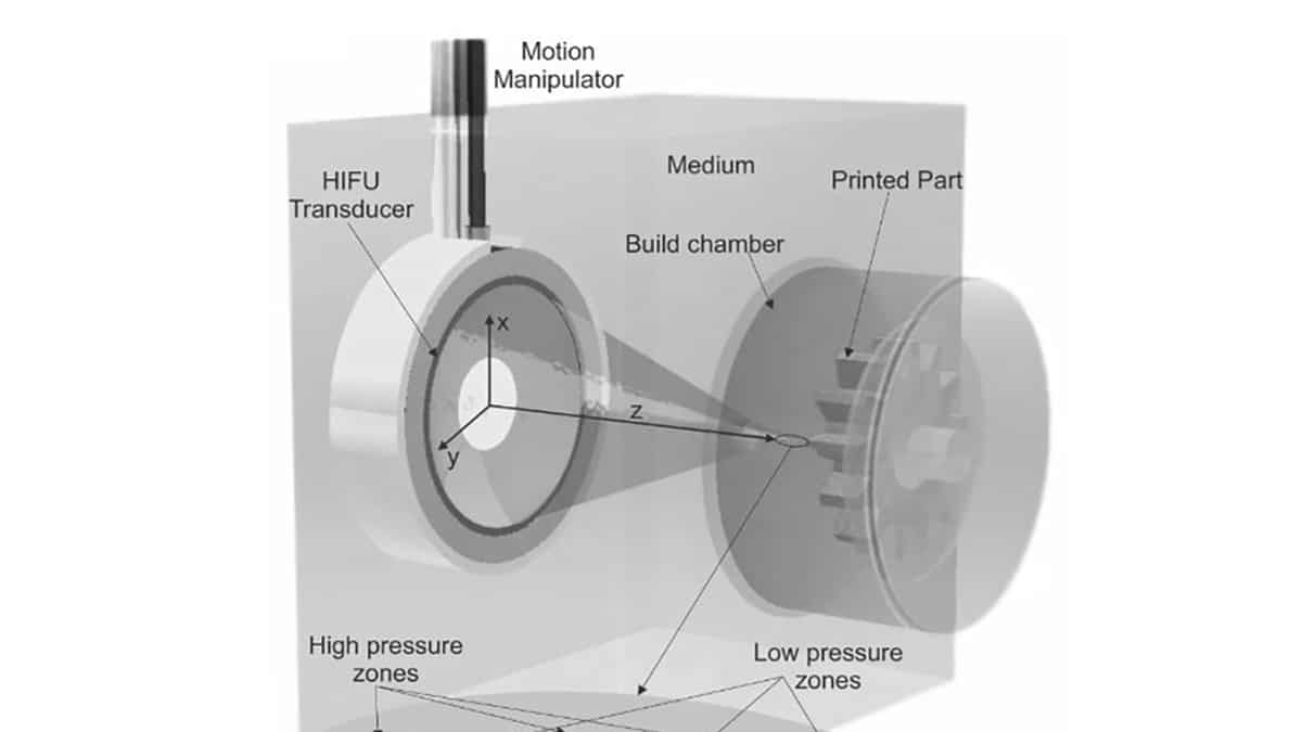 The new technology is called Direct Sound Printing, and it’s based around using a very precise ultrasound transmitter to create solid shapes inside a tank of resin. The light emitters in a SLA or VLM 3D printer can only harden the surface layer of resin, but the ultrasound emitter in a DSP printer doesn’t have this limitation. The energy it emits can be focused at a specific depth within the resin, and until it’s focused it isn’t intense enough to do much. When it is focused, though, interesting things start to happen.