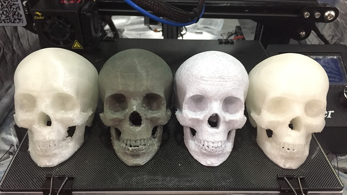 In terms of actual plastic these filaments are all PLA, so I didn’t expect any problems with 3D printing them, and that’s how it turned out. My standard PLA settings are 200°C on the nozzle and 60°C for the bed, and all four prints worked out nicely. There was some stringing around the eye sockets and nose, which cleaned up easily enough. The new TL smoothers on the Ender 3 are definitely earning their money, too – none of the prints showed any sign of “salmon skin” problems. So let’s take a look at the details of each filament.
